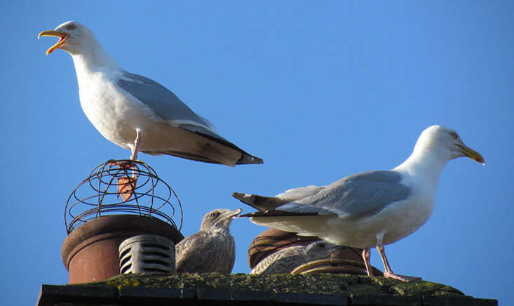 Een tijdje geleden is meester Meeuwenmoller het dak opgeklommen. Een gezinnetje uit het beruchte vogelras had zich op zijn dak gevestigd. Hij was daar niet van gediend. Daarom wilde hij een stokje voor hun plannetje steken. Binnen enkele minuten had hij de toegang tot het meeuwennest gesloten door met een dakpan de ingang te blokeren.
