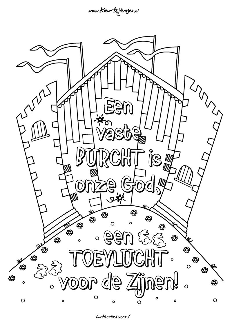 Een kleurplaat met het bekende gezang van Maarten Luther. Geschikt voor bijvoorbeeld Hervormingsdag.